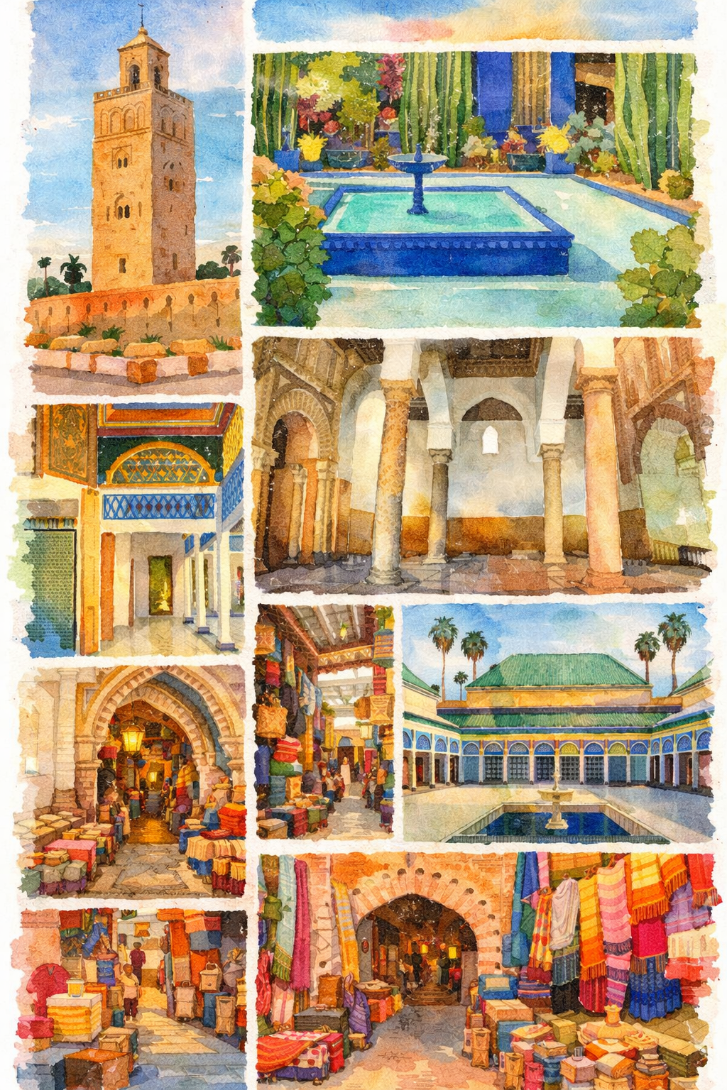 Jardin Majorelle + Musée YSL • Musée Pierre Berger • Le Jardin Secret (≈100 MAD) • Cyber Parc (gratuit) • Jardins de la Koutoubia.